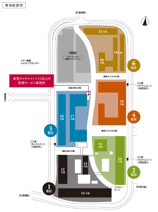 「東雲キャナルコート CODAN」の約40,000㎡に及ぶ広大な敷地には、緑道や中庭などのオープンスペース、商業施設、クリニック、子育て支援施設などが充実し、まるでひとつの街のよう。