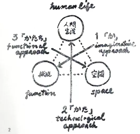上に、故菊竹清訓先生の設計理論を示した図は、設計のときに悩みを整理する上のもやもやを整理する上で非常に重要な図だと思っています。