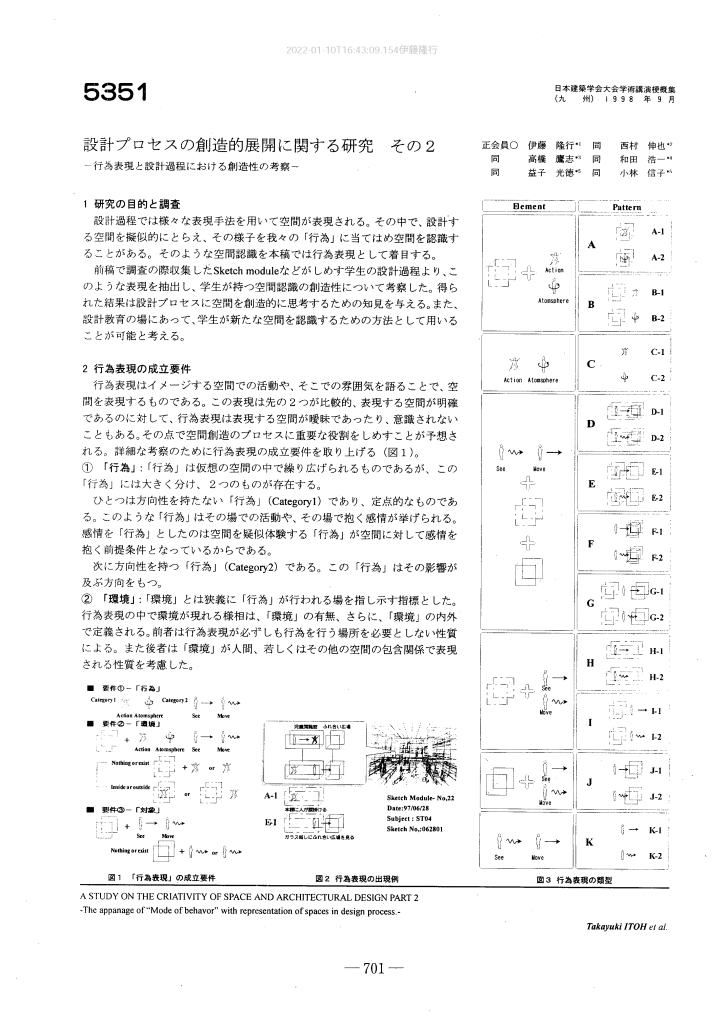 学生の設計プロセスを研究対象とし、設計過程が創造的な方向に向かう場面の特性を分析した。設計過程で様々な見方で設計対象を表現するタイミングが存在し、そのようなタイミングにおいて、厳密に定義できない「仮想行為」が様々な環境や設計対象を認識させる具体的なきっかけになっている様相を明らかにした。