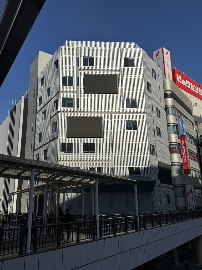 こうなっちゃうかね? 2025年01月10日 立川駅北口前のビルがお召替えしました。ディスプレイビルボードが4枚くらいついていて、排煙に必要と思われる開口のところだけ外壁ルーバーが外れているデザイン。ごめんなさい「これじゃない」感があまりにもあり過ぎて、残念です。前の方がまだよかったよ。